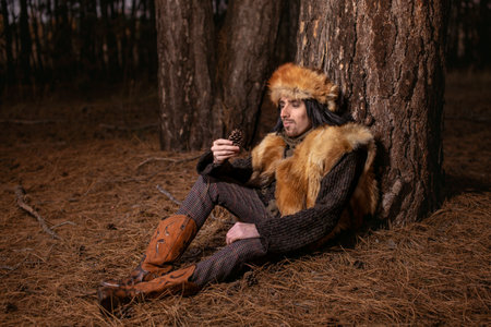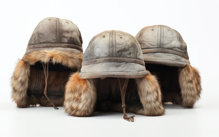 This stock photo features historical cold-weather garments and tools made from natural materials, highlighting ancient craftsmanship and survival techniques.