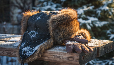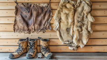 This captivating image showcases traditional winter clothing made from fur and leather, along with rugged boots, displayed against a wooden wall, highlighting outdoor adventure.