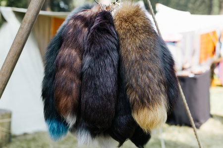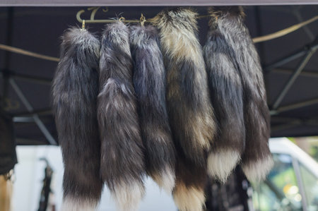 a lot of fox tails hanging in a street market. Raccoon or silver fox tails as decoration for bikers