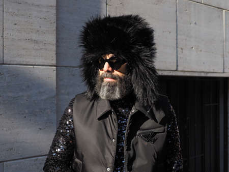 Close up portrait of a man wearing a stylish fur hat, showing unique fashion and expression