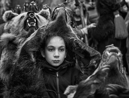 People dancing dressed in bearskin and folk costumes at the Comanesti Customs and Traditions Festival on December 30, 2025
