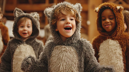 A group of joyful children dressed in adorable animal costumes enjoys a fun playtime in an inviting indoor space, fostering creativity and friendship.