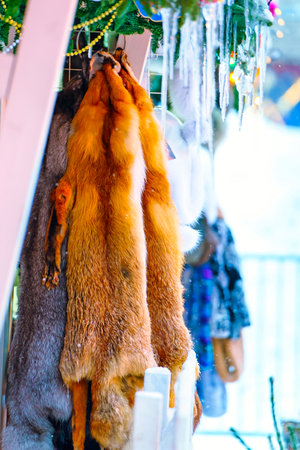 Skinned fox and other animals furs on exhibition at a peasants fair in Bucharest, Romania.