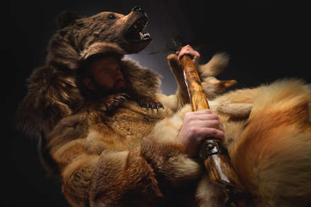 Portrait of a medieval bearded military monk, dressed in animal skins and burlap, holding a battle ax. Low key. Focus on your clothes. Atmospheric portrait of a character from a RPG game