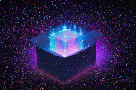 A simple cardboard container bathed in intense amber light creates angular shadows against a lively yellow and fiery orange background, emphasizing bold contrasts.