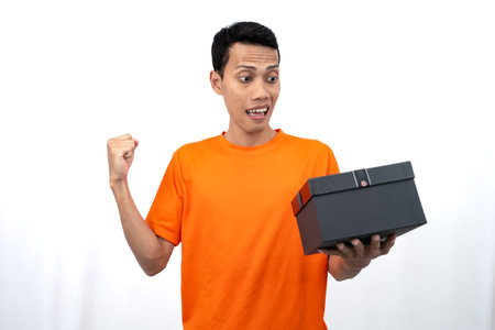 Portrait of a young Asian man wearing an orange t-shirt with a happy expression, surprised to get a gift. Isolated on white background.