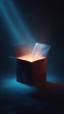 An unfilled cardboard container with open flaps rests on a striking orange backdrop, illuminated gently, ideal for illustrating shipping, storage, or logistics theme