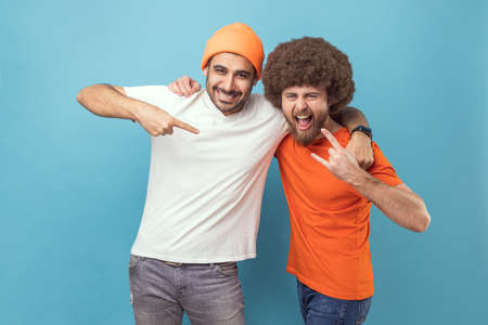 Portrait of two men hugging each other, guy with Afro hairstyle showing rock and roll sign hand gesture, male in beanie hat pointing at his friend. Indoor studio shot isolated on blue background.