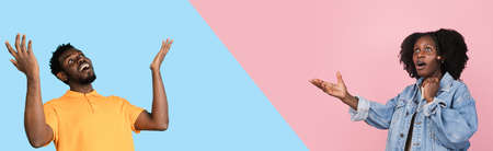 Portraits of two african models on bicolored background in magazine style, collage.