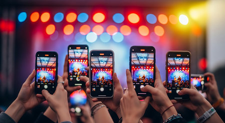 Audience capturing live concert moments on their smartphones at night, with colorful stage lights and bokeh atmosphere.