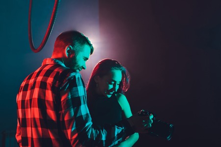 Young happy woman making a face and posing at camera while man photographing her at a party