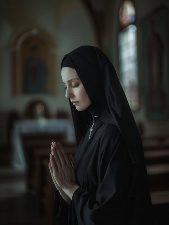 A serene Caucasian nun in a black habit stands in deep prayer inside a church.
