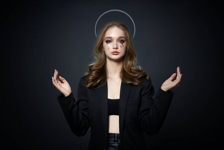 Beauty fashion portrait blonde woman with nimbus on head, natural cosmetics, black clothes. Drops of makeup trickle from the girl eyes. Saint woman