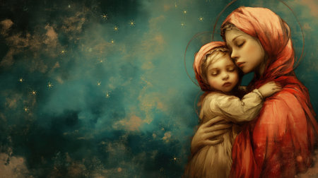 Tender Moments: Mother and Child Embrace in Ethereal Art with Starry Night Background