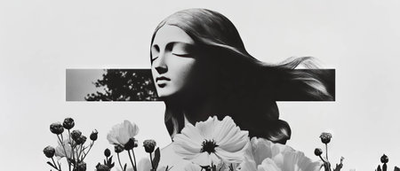 Minimalist collage featuring a statue with flowing hair and floral elements