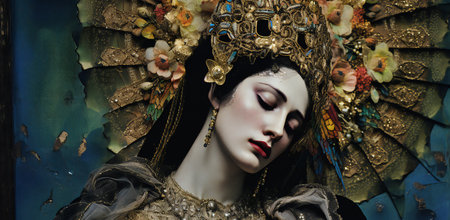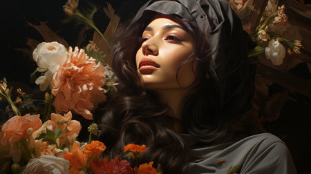 Serenity radiates from her peaceful expression as she embraces a gentle stillness, wrapped in a richly patterned shawl amidst a softly veiled, dreamlike setting.