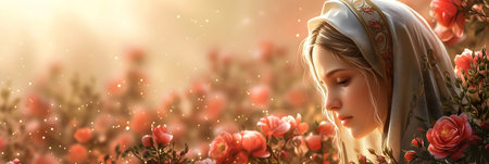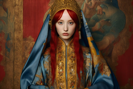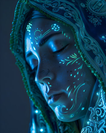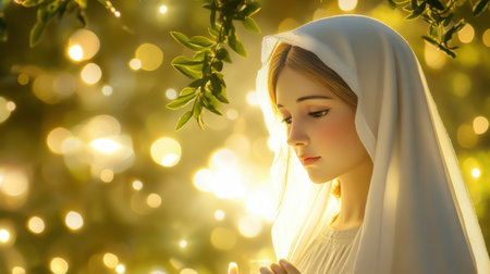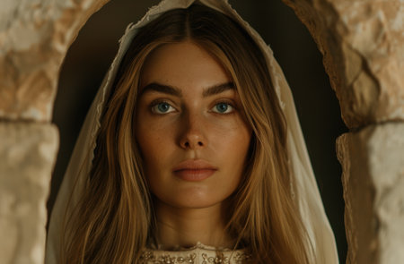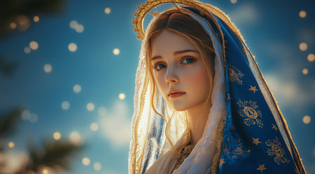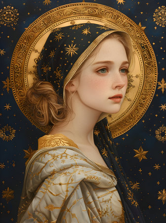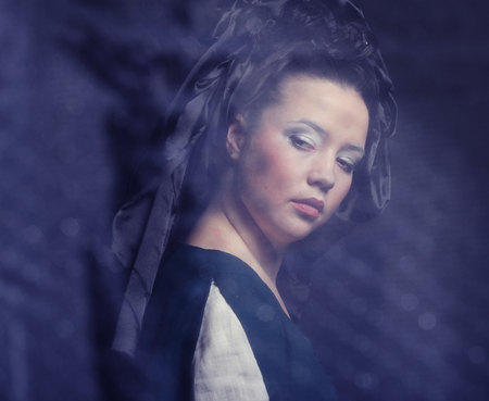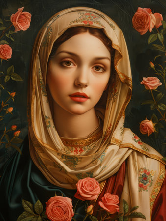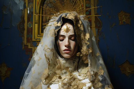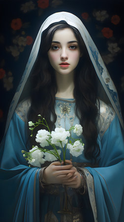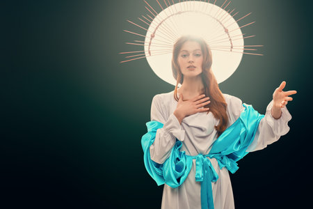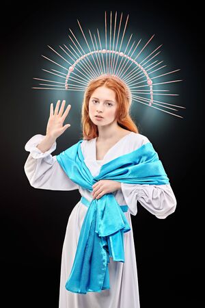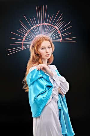 Portrait of a beautiful young woman in the image of the Virgin Mary.