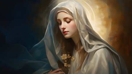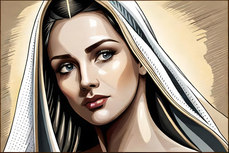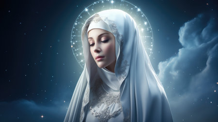 digital painting Illustration portrait of the holy virgin Mary with a veil, aureole and a christian cross
