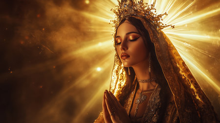 A serene young woman in ornate attire raises her hands in prayer, illuminated against a golden backdrop during a spiritual moment