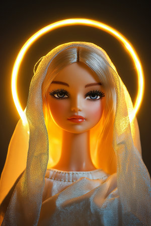 Artistic portrayal of a classic doll as a heavenly figure in golden light, saint. Modern beauty standards, idols from magazine, plastic surgery concept.