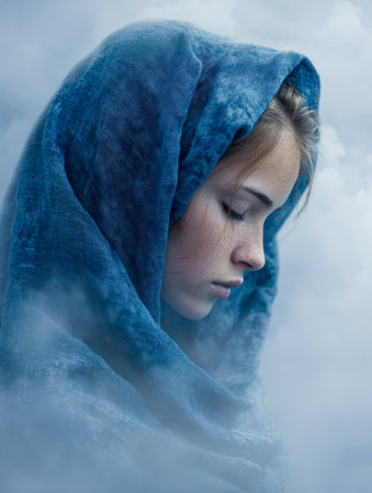A tranquil profile of a young woman with eyes gently closed, enveloped in a richly textured indigo shawl, amid a gentle fog and drifting clouds inspiring calmness.