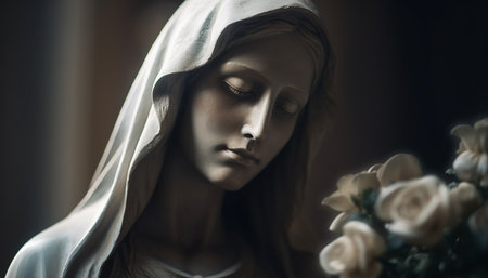 This close-up captures a beautifully detailed statue of a praying holy woman, showcasing intricate craftsmanship and vibrant colors, ideal for themes of spirituality and devotion.