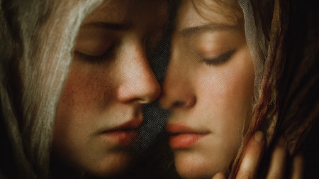 Two women share a tender moment as they softly press their faces against each other, enveloped in a light fabric that enhances their emotional connection.