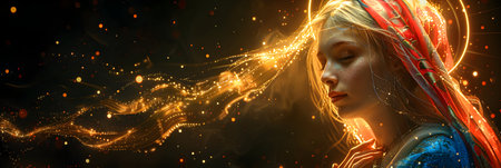 The Virgin Mary portrait on a dark background with nimbus in rays of light. Modern art in religion.