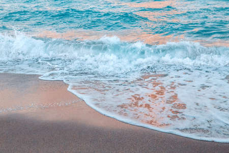 Sea wave crashing sand on sunset evening beach. Dusk ocean tide splashing coastline outdoors. Close up white foam water surface storming on beautiful romantic sunrise shore. Scenic nature concept.