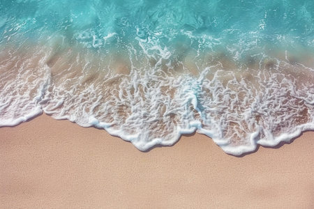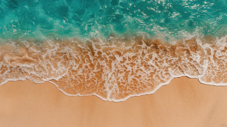Aerial view of serene beach with turquoise water gently lapping against soft, sandy shore. natural tones create calming atmosphere, perfect for relaxation and escape