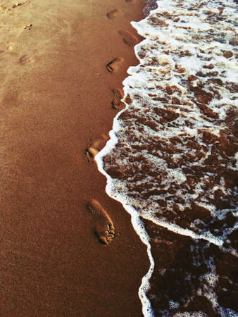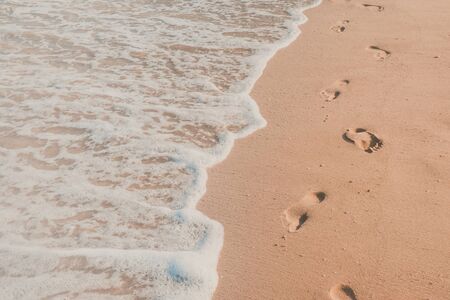 human foot prints on the sand beach with wave foam