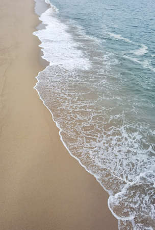 Soft foaming wave of the blue sea hits the sandy shore. Beach and water texture, moody vertical background. Summer vacation seaside, holiday recreation concept