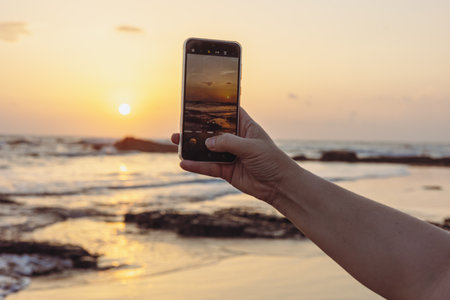 Woman holding mobile phone in hand and taking sunrise photo. Woman using smart phone take a photo at evening on the beach of sunset. Travel photo, copy space.