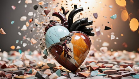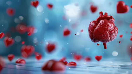 A vibrant heart model surrounded by colorful floating shapes and hearts, symbolizing love and emotion, perfect for health and creative projects.