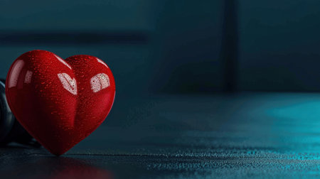 Shiny red heart symbolizes love and affection, resting on dark surface with soft blue background. heart glossy finish reflects light, creating captivating visual