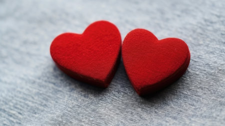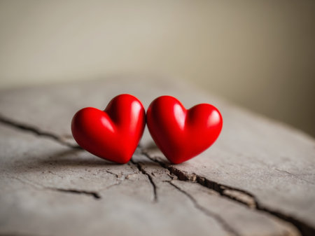AI Generated. Two Vibrant Red Hearts on Rustic Wood Surface