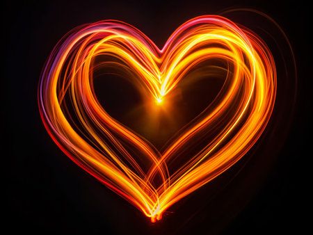 Light painting technique is creating a beautiful, glowing heart shape against a vibrant red background, symbolizing love, passion, and romance, perfect for valentines day or anniversaries