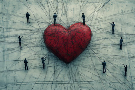 A heart enveloped in strings with individuals positioned on opposite sides, captured in photography