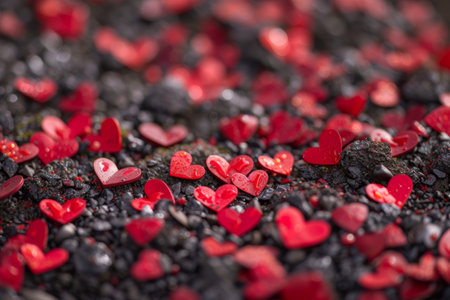 Heart-shaped confetti creates a romantic atmosphere against a dark backdrop