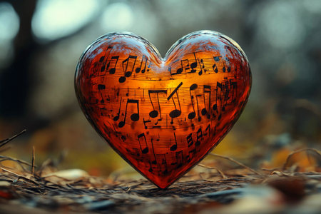 A striking heart-shaped sculpture filled with musical notes rests gracefully among autumn foliage. The sun filters through trees, casting a warm glow on this artistic representation of love and music.