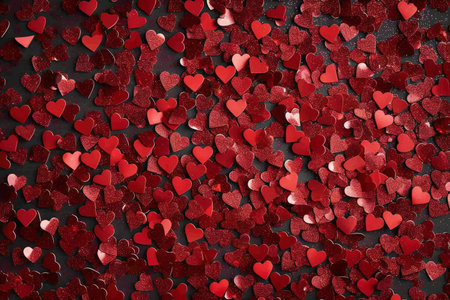 Red hearts confetti on a dark background. Valentine's Day.