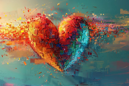 Illustration captures a heart formed from digital pixels exploding in warm, dynamic hues