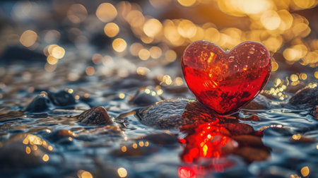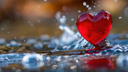 Red heart-shaped crystal on the water surface with a splash. Love symbol.