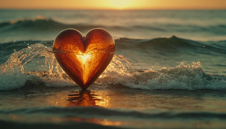 Heart with water drops on the beach at sunset. Love concept.