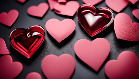 A collection of red hearts of various textures and shades, some shiny and others matte, arranged on a black background. The hearts represent love, romance, and the celebration of Valentine's Day.
