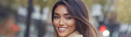 A young woman with long hair smiles brightly while strolling along a busy city street. She is dressed warmly for the cool autumn weather surrounded by trees and city life.