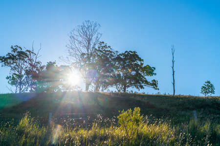 Typical sunny Queensland rural background landscape looking into sun with sun burst through trees.