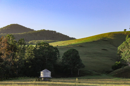 Sunrise over a rural landscape, casting golden light across farmland, trees, and open countryside. Peaceful morning scene highlighting natural beauty and rustic charm in Australia