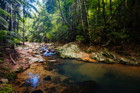 A road traveling through lush tropical rainforest with patches of light on the trees - Eungella National Park, Queensland, Australia