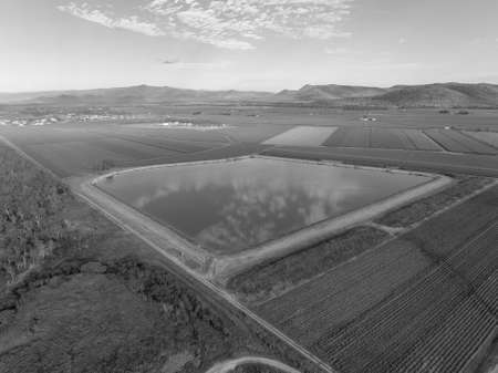 Monotone of a square shaped rural dam amongst sugarcane fields with a township in the distance